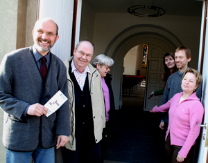 Superintendet Peter Burkowski, Ernst-Peter und Barbara Oetting, Pfarrerin Kerstin Schütz, Ulrich Kamien und Pfarrerin Silke Niemeyer am Eingang der Gustav-Adolf-Kirche